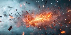 Cosmic Collision: A cataclysmic explosion erupts in a universe of chaos, sending a shower of debris and fiery fragments into the void of space