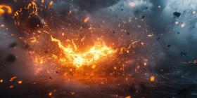 Cosmic Collision: A cataclysmic explosion erupts in a universe of chaos, sending a shower of debris and fiery fragments into the void of space