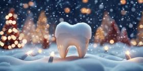 Winter Wonderland Smile: A sparkling white tooth, dusted with snow and surrounded by festive ornaments, symbolizes the importance of maintaining oral health throughout the holiday season