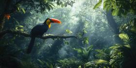 A Tropical Oasis: A vibrant toucan, perched on a branch amidst a lush jungle canopy, basks in the warm sunlight, creating a scene of tranquility and exotic beauty