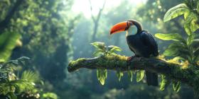 A Tropical Oasis: A vibrant toucan, perched on a branch amidst a lush jungle canopy, basks in the warm sunlight, creating a scene of tranquility and exotic beauty