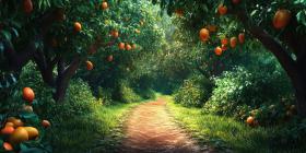 A Path of Citrus: A sun-dappled path winds through a vibrant orange grove, laden with ripe, juicy fruit, promising a sweet and refreshing journey