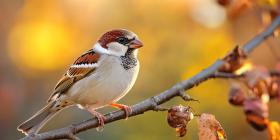 A Feast for the Eyes: A vibrant sparrow, perched on a branch laden with ripe berries, showcases its colorful plumage against a backdrop of autumnal hues