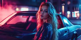 Stylish Individual with Long Hair and Leather Jacket Posing by a Vintage Car Under Vibrant Neon Lights in Urban Nightscape