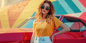 Stylish Individual with Long Hair and Leather Jacket Posing by a Vintage Car Under Vibrant Neon Lights in Urban Nightscape