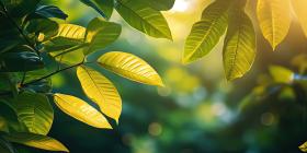 A Verdant Tapestry: Sunlight filters through a lush canopy of emerald green leaves, creating a mesmerizing tapestry of light and shadow in the heart of a tropical paradise