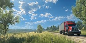 A Road Less Traveled: A lone red truck traverses a vast, open landscape, its journey paralleled by a dramatic sky filled with billowing clouds