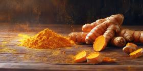 A Golden Treasure: Vibrant turmeric roots and a mound of golden powder, showcased against a rustic wooden backdrop, highlight the rich hues and potential benefits of this ancient spice