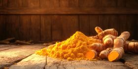 A Golden Treasure: Vibrant turmeric roots and a mound of golden powder, showcased against a rustic wooden backdrop, highlight the rich hues and potential benefits of this ancient spice