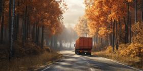 Autumnal Odyssey: A crimson truck, a beacon of industry, navigates through a forest ablaze with autumnal colors, embarking on a journey through the changing seasons