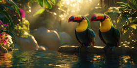 A Toucan Rendezvous: Two vibrant toucans, with their iconic beaks, share a moment on a moss-covered branch, amidst a lush tropical setting