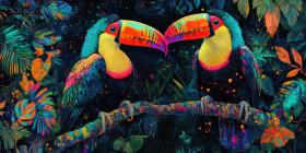 A Toucan Rendezvous: Two vibrant toucans, with their iconic beaks, share a moment on a moss-covered branch, amidst a lush tropical setting