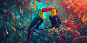 A Toucan Rendezvous: Two vibrant toucans, with their iconic beaks, share a moment on a moss-covered branch, amidst a lush tropical setting