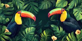 A Toucan Rendezvous: Two vibrant toucans, with their iconic beaks, share a moment on a moss-covered branch, amidst a lush tropical setting