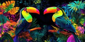 A Toucan Rendezvous: Two vibrant toucans, with their iconic beaks, share a moment on a moss-covered branch, amidst a lush tropical setting