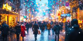 Festive City Street Scene with Falling Snow and Holiday Decorations Amidst Busy Shoppers