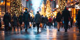 Festive City Street Scene with Falling Snow and Holiday Decorations Amidst Busy Shoppers