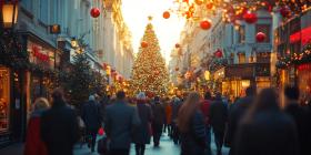 Festive City Street Scene with Falling Snow and Holiday Decorations Amidst Busy Shoppers