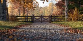 A Path Through Autumn: A gravel driveway, flanked by vibrant foliage and a rustic wooden gate, beckons the traveler into a world of autumnal beauty