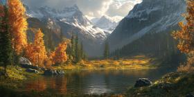 A Tapestry of Peaks: A breathtaking panorama of snow-capped mountains, verdant valleys, and crystal-clear lakes, bathed in the warm glow of the sun