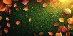 Autumns Embrace: A vibrant tapestry of fallen leaves, in shades of orange, red, and gold, creates a picturesque frame around a lush green lawn