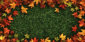 Autumns Embrace: A vibrant tapestry of fallen leaves, in shades of orange, red, and gold, creates a picturesque frame around a lush green lawn