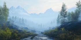 A Misty Enchantment: A winding path leads through a mystical landscape, where towering snow-capped mountains loom through a veil of mist, creating a scene of otherworldly beauty