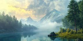 A Misty Enchantment: A winding path leads through a mystical landscape, where towering snow-capped mountains loom through a veil of mist, creating a scene of otherworldly beauty