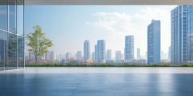 A Skyward View: A modern building offers a panoramic vista of a bustling metropolis, where towering skyscrapers pierce the horizon under a bright, blue sky