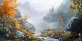A Misty Enchantment: A winding path leads through a mystical landscape, where towering snow-capped mountains loom through a veil of mist, creating a scene of otherworldly beauty