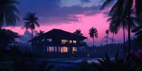Tuscan Twilight: A charming villa, bathed in the warm glow of a setting sun, sits perched amidst a picturesque landscape, offering breathtaking views of distant mountains and a sky ablaze with color
