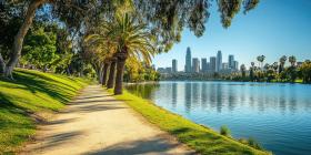 Urban Oasis: A tranquil lakeside path winds through a lush park, offering a serene escape from the bustling cityscape beyond, with the iconic Los Angeles skyline as a breathtaking backdrop
