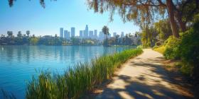 Urban Oasis: A tranquil lakeside path winds through a lush park, offering a serene escape from the bustling cityscape beyond, with the iconic Los Angeles skyline as a breathtaking backdrop