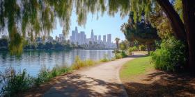 Urban Oasis: A tranquil lakeside path winds through a lush park, offering a serene escape from the bustling cityscape beyond, with the iconic Los Angeles skyline as a breathtaking backdrop