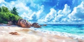 A Tropical Idyll: A picturesque coastal village, nestled amidst swaying palm trees, offers a glimpse of paradise, with pristine beaches and crystal-clear waters