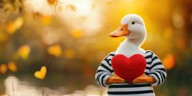 A Heartfelt Quack: A fluffy duck, sporting a striped sweater, holds a heart close to its chest, spreading a message of love and warmth