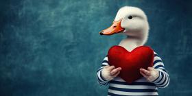 A Heartfelt Quack: A fluffy duck, sporting a striped sweater, holds a heart close to its chest, spreading a message of love and warmth