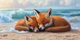 Coastal Dreams: Two Fox Kits Napping on the Beach