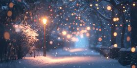 Enchanting Winter Scene with Twinkling Lights and Snow-Dusted Branches