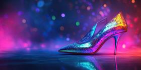 Elegant High-Heeled Shoes with Glittery Finish: Stylish Footwear in a Vibrant, Colorful Setting with Reflective Surface
