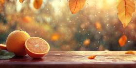 Autumnal Delight: Fresh Oranges on a Wooden Table with Falling Leaves and Raindrops