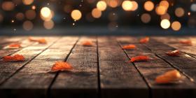 Autumnal Delight: Fresh Oranges on a Wooden Table with Falling Leaves and Raindrops