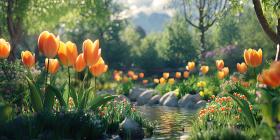 A Serene Garden Oasis: A Stream Winds Through a Meadow of Vibrant Tulips