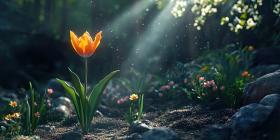 A Serene Garden Oasis: A Stream Winds Through a Meadow of Vibrant Tulips