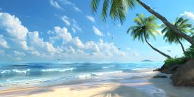 Endless Horizon: A Tranquil Beachscape with White Clouds Drifting Across a Sapphire Sky