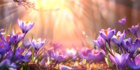 Springtime Serenity: A Mountain Landscape with Blooming Crocuses and a Sunlit Sky