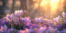 Springtime Serenity: A Mountain Landscape with Blooming Crocuses and a Sunlit Sky