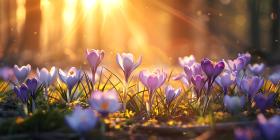 Springtime Serenity: A Mountain Landscape with Blooming Crocuses and a Sunlit Sky