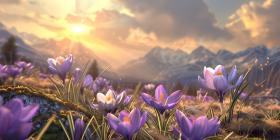 Springtime Serenity: A Mountain Landscape with Blooming Crocuses and a Sunlit Sky