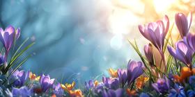 Springtime Serenity: A Mountain Landscape with Blooming Crocuses and a Sunlit Sky